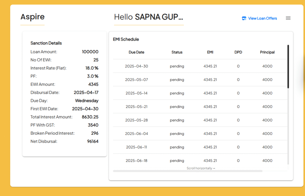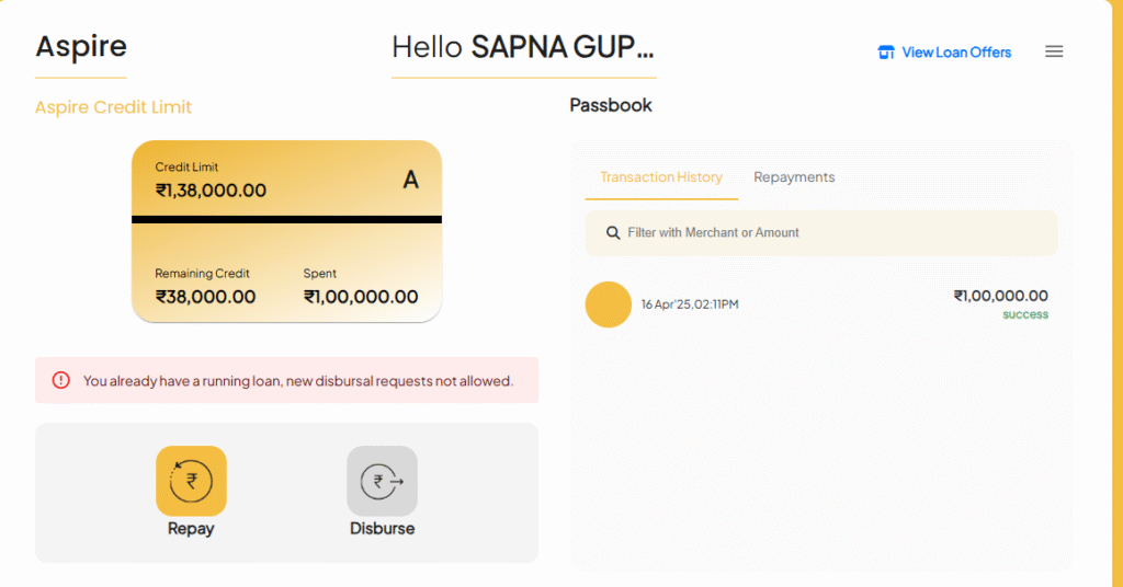 Just select the disbursement amount and the amount will credit it in your bank account within three hours and it is a credit limit system emis will be deducted weekly like Swiggy Payout, You can check everything on the aspire website the interest charges are also fixed so it is very beneficial to close the loan as soon as possible to save the interest.